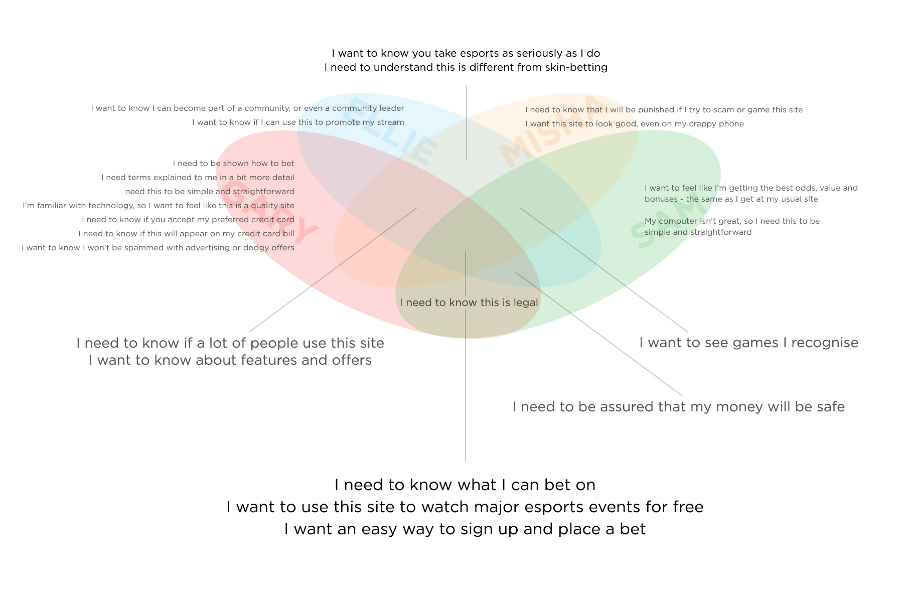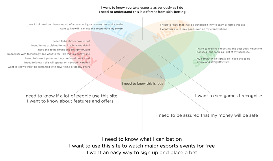 For example, several of the personas were uncertain about the legality of betting on esports. In the persona diagrams, this was expressed as the need: "I need to know it's legal and trustworthy".