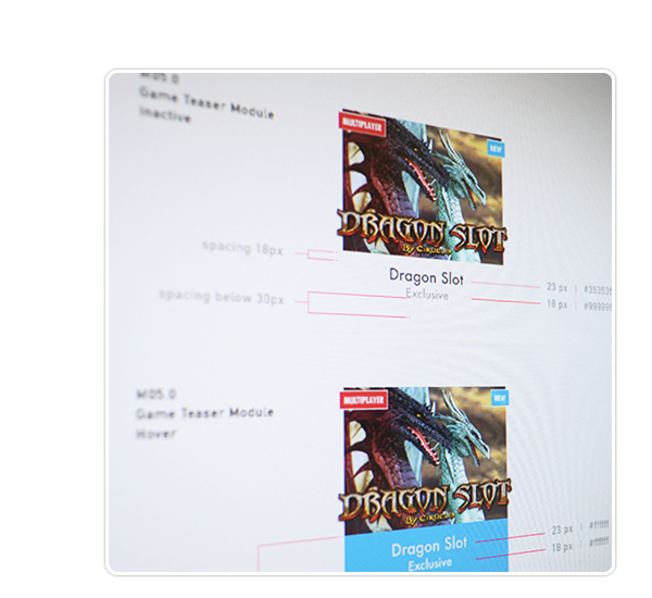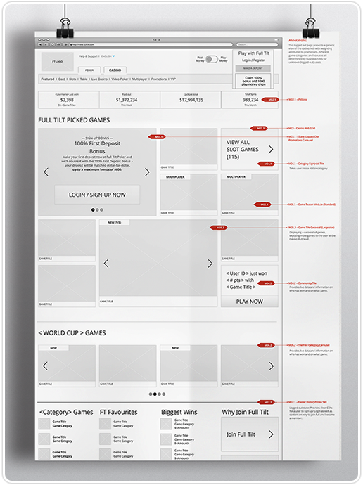 In this case, the need to work in parallel with our development team required some innovative thinking. So, instead of taking a conventional page-by-page design approach, we created a 'functional map' of the website. We identified specific modules (e.g. a 'game state module', a 'game teaser' module, a 'user balance' module, a 'game filter' module). For now it didn't matter what page each module appeared on - by creating functional wireframes of each module we freed up development resources to build the underlying code.